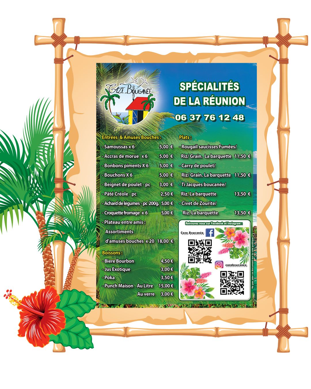Nous vous proposons toutes sortes de bouchées apéritives comme samoussas, accras de morue, bonbons piment, beignets de poulet... ensuite en assiette de délicieux plats traditionnels comme le rougail saucisses, carry de poulet et bien d'autres encore. N'hésitez pas à nous contacter par téléphone au 06 37 76 12 48. Nous espérons à très bientôt. Gladys et Christophe